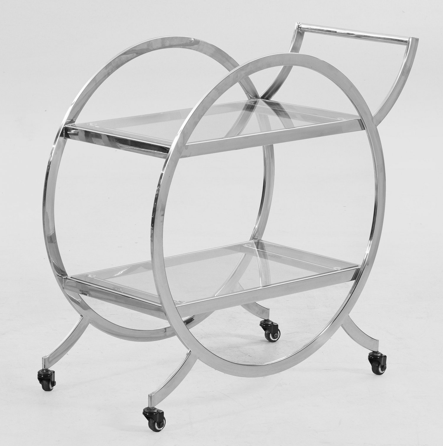 Barwagen im Art Déco-Stil Metall, verchromt und farbloses Glas. Offen gestaltetes Gestell aus zwei großen Ringmotiven aus ausgestellten Beinen mit Rollen als Träger für rechteckige Abstellflächen. Korrespondierender Griff. H. 82 cm. 86 cm x 38 cm.