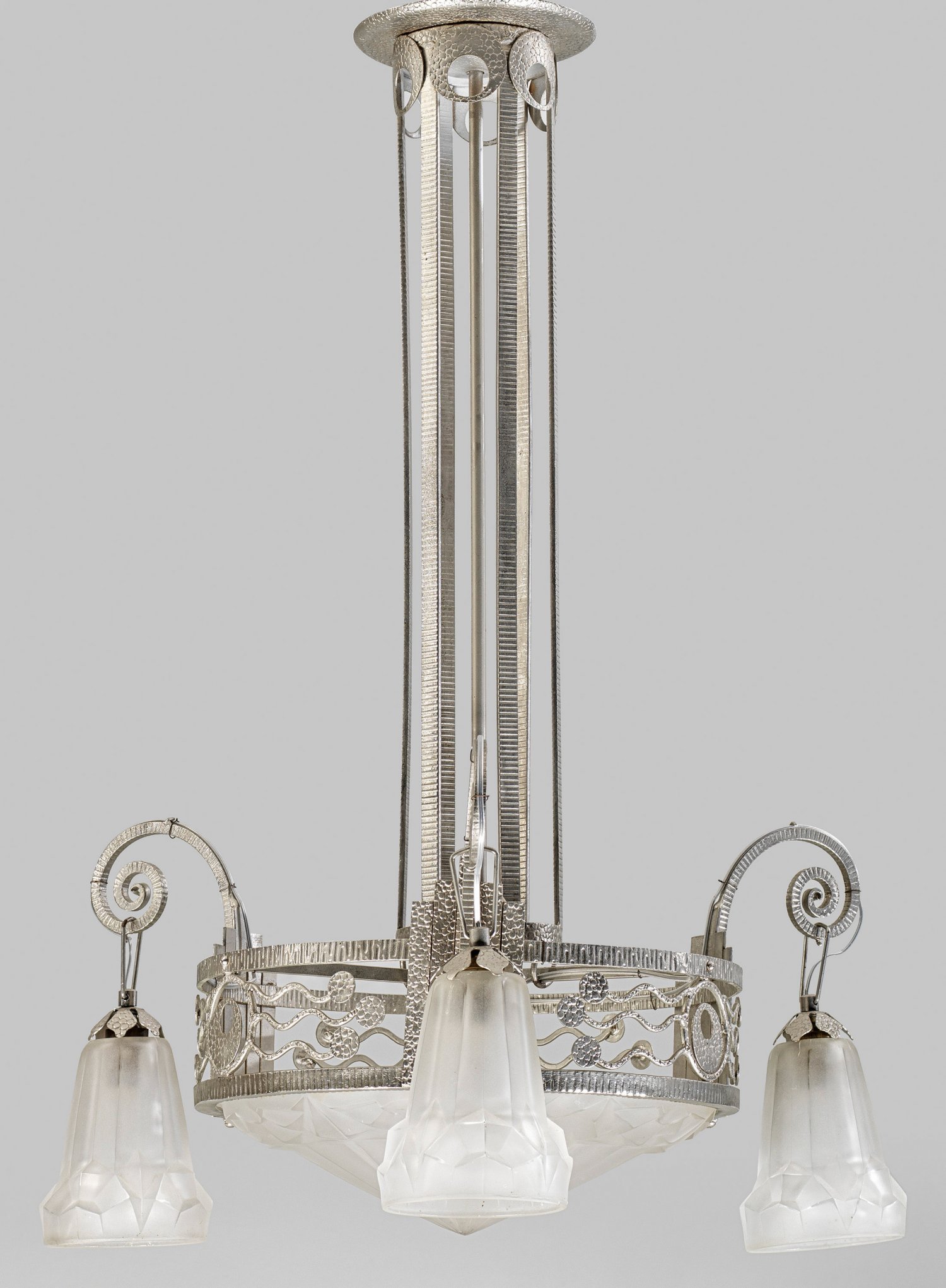 Art Déco-Deckenlampe 3-flg.; Weißmetall sowie farbloses satiniertes Glas. Breiter, ornamental durchbrochen gearbeiteter Reif als Träger für spitz zulaufende Kuppel. Davon ausgehend stark geschwungene Leuchterarme aus eingerollten Voluten als Träger für Leuchtmittel mit kelchförmigen Lampenschirmen. Offen gestalteter Schaft als Aufhängung. Elektrifiziert. H. 82 cm. D. 53 cm.