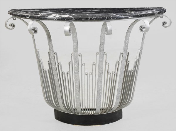 Großer Art Déco-Konsoltisch Schmiedeeisen, silbergrau lackiert sowie dunkelgrauer, cremefarben gemaserter Marmor. Bombierter, offen gestalteter Korpus aus stark geschwungenen, weit vorkragenden, eingerollten Volutenstreben mit Reliefdekor sowie gestaffelt angeordnetem Gitterwerk als Träger für profilierte Deckplatte. H. 94 cm. 130 cm x 49 cm.