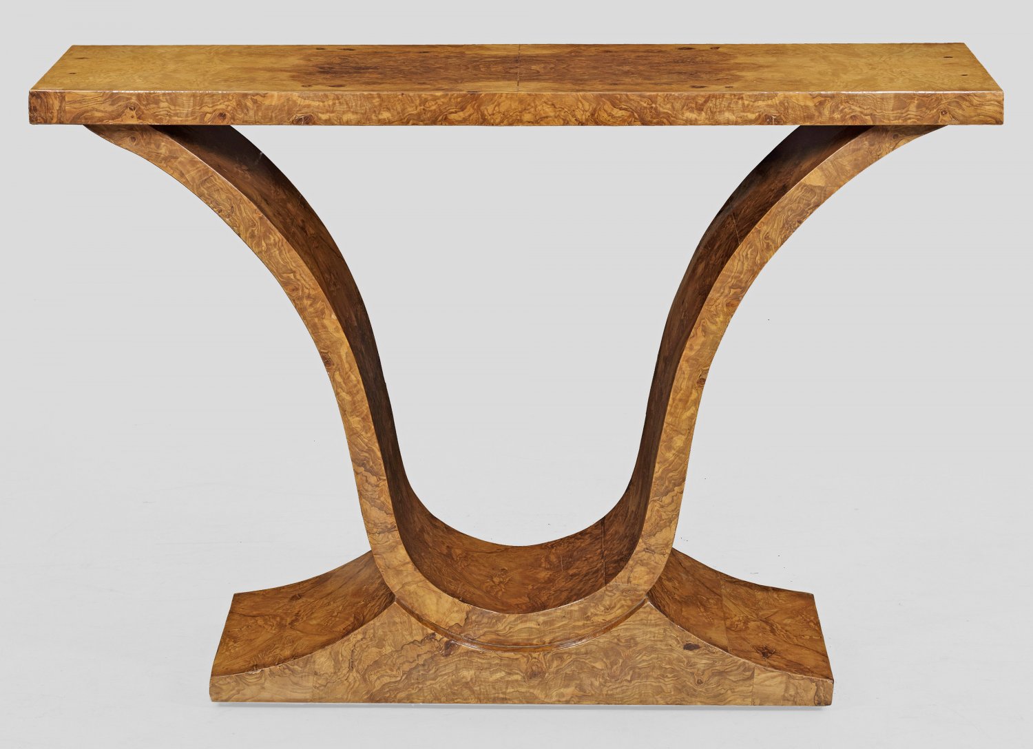 Konsoltisch im Art Déco-Stil Rüster, furniert und teilw. in Maseroptik gebeizt. Über breiter, teilw. konkav eingezogener Sockelplatte breite, weit ausschwingende Seitenwange als Träger für rechteckige Deckplatte. H. 81 cm. 120 cm x 40 cm.