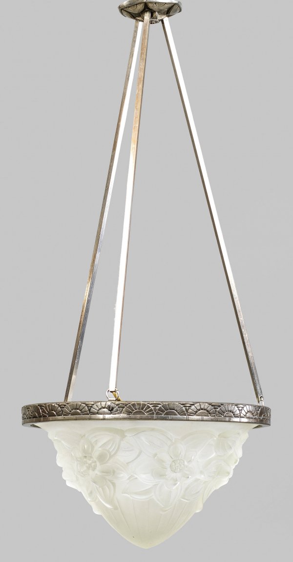 Art Déco-Deckenlampe 1-flg.; Messing, vernickelt sowie farbloses, satiniertes Glas. Schmaler, reliefierter Reif als Träger für kuppelförmigen, konisch zulaufenden Lampenschirm mit großen Blütenmotiven, minim. besch.; Aufhängung aus schräggestellten Vierkantstreben mit korrespondierendem oberen Abschluss. Elektrifiziert. H. 80 cm. D. 36 cm.