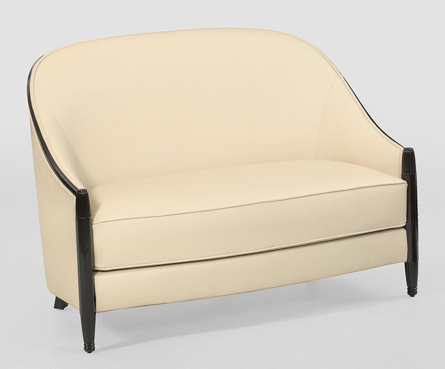 Kleines Art Déco-Sofa Holz, schwarz glänzend lackiert sowie cremefarbenes Leder. Schmale Zarge, flankiert von gekanteten, teilw. godronierten Stützen. Schmale, steil ansteigende Armlehnen sowie gewölbte Rückenlehnenrahmung. Allseitig gepolstert und bezogen. H. 92 cm. 124 cm x 75 cm. Sitz-H. 45 cm.