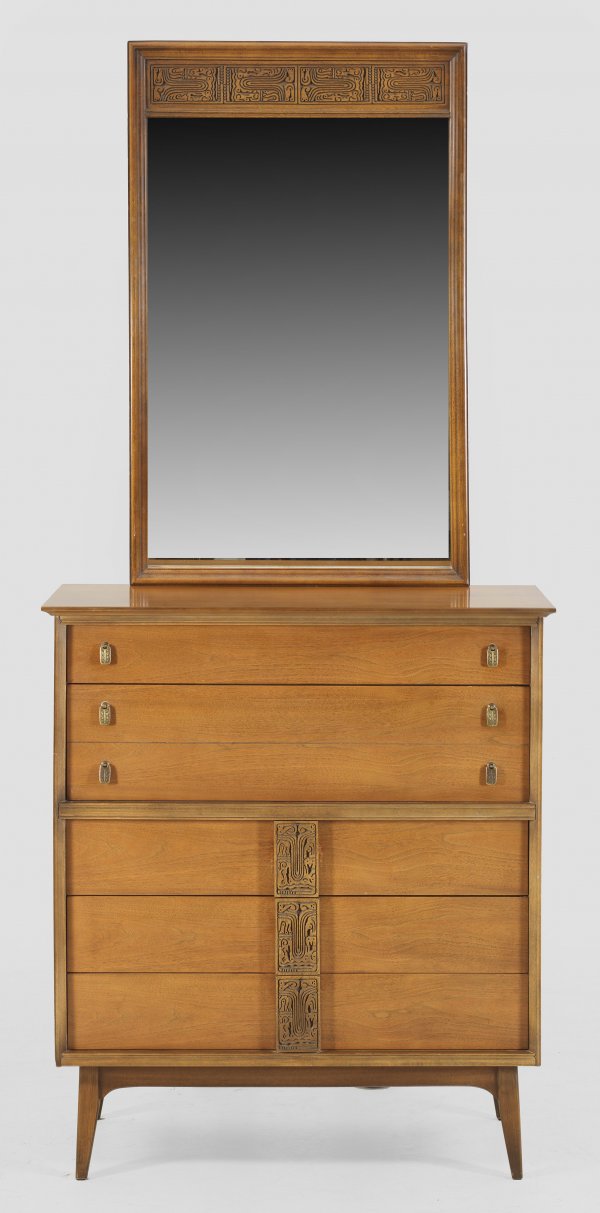 Mid Century-Kommode mit Spiegel von Bassett aus der sog. "Mayan" Collection. Nussbaum, furniert. Gerader, rechteckiger, schauseitig umlaufend profilierter Korpus auf zurückgesetzten, schräggestellten Füßen. In der gegliederten Front fünf breite Schubladen unterschiedlicher Größe, teilw. mit abstrakt reliefierten Handhaben. Korrespondierender Wandspiegel. Kommode mit Herstellerzeichen sowie rückseitig Etikett BEKINS. Kommoden-H. 114,5 cm. 102 cm x 48 cm. Spiegel: 115 cm x 72 cm.