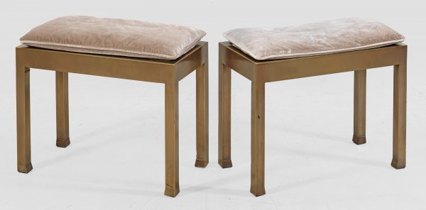 Paar Design-Sitzbänke "Gong" von Romeo Sozzi Bronze, patiniert. Gerade, rechteckige Zarge auf gekanteten Beinen mit nach innen schräggestellten Enden. Sitzfläche mit silbergrauer Samtpolsterung. 1x mit Herstellerzeichen. H. 48 cm. 60 cm x 30 cm.