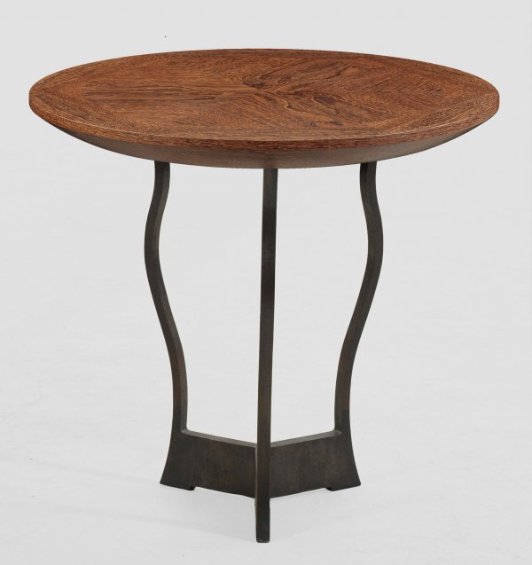 Design-Beistelltisch "Erasmo" von Romeo Sozzi Wengé-Holz und Bronze, dunkel patiniert. Offen gestaltetes Gestell aus geschwungenen Vierkantstreben, durch gegeneinander gestellte Stege als Sockel verbunden. Oberhalb kräftige, runde Deckplatte. Unbez.; Entw. Romeo Sozzi. H. 65 cm. D. 70 cm.