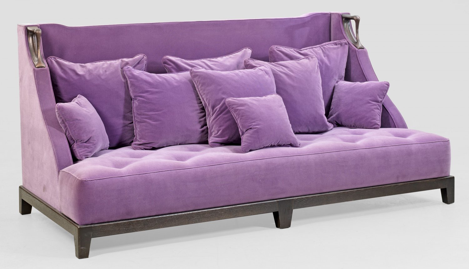 Großes extravagantes Sofa "Albert Basso" von Romeo Sozzi Eichenholz, schwarz gebeizt, Bronze, dunkel patiniert sowie fliederfarbener Samt. Gerade Zarge auf leicht konischen Füßen als Träger für tiefe, rechteckige Sitzfläche mit Knopfpolsterung. Hohe Rückenlehne, flankiert von steil ansteigenden Seitenwangen mit offen gestalteten, kühn geschwungenen Bronzegriffen. Allseitig gepolstert und bezogen. Entw. Romeo Sozzi. H. 121 cm. 253 cm x 124 cm. Sitz-H. 44 cm. NP ca. 28.000,- Euro.