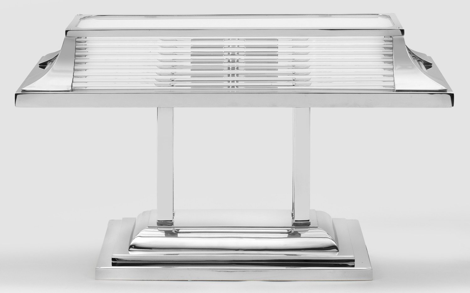 Große Schreibtischlampe im Art Déco-Stil 2-flg.; Metall, vernickelt sowie farbloses, teilw. satiniertes Glas. Über gestuft ansteigendem Sockel gerade Streben als Träger für breiten, pagodenförmigen Lampenschirm aus Rundstäben. Elektrifiziert. H. 41 cm. 69 cm x 29 cm.