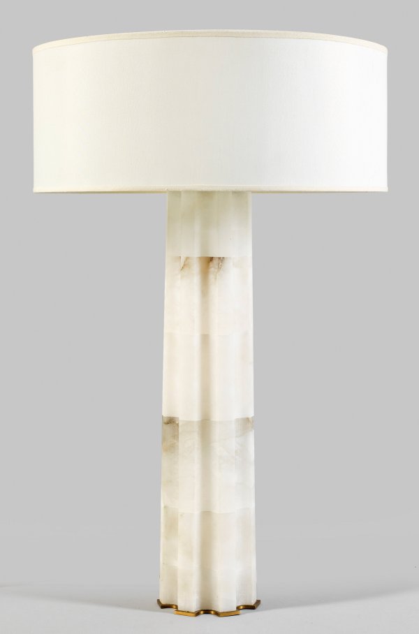 Tischlampe "Athéna" von Hervé van der Straeten 2-flg.; Weißer, hellgrau gemaserter Alabaster und Bronze. Sich konisch verjüngender, tief kannelierter Schaft auf flacher Sockelplatte mit korrespondierendem oberen Abschluss als Träger für Leuchtmittel. Runder, flacher, mit cremeweißem Stoff bespannter Lampenschirm. Elektrifiziert. Herstellerzeichen HV. Entw. Hervé van der Straeten, 2012.