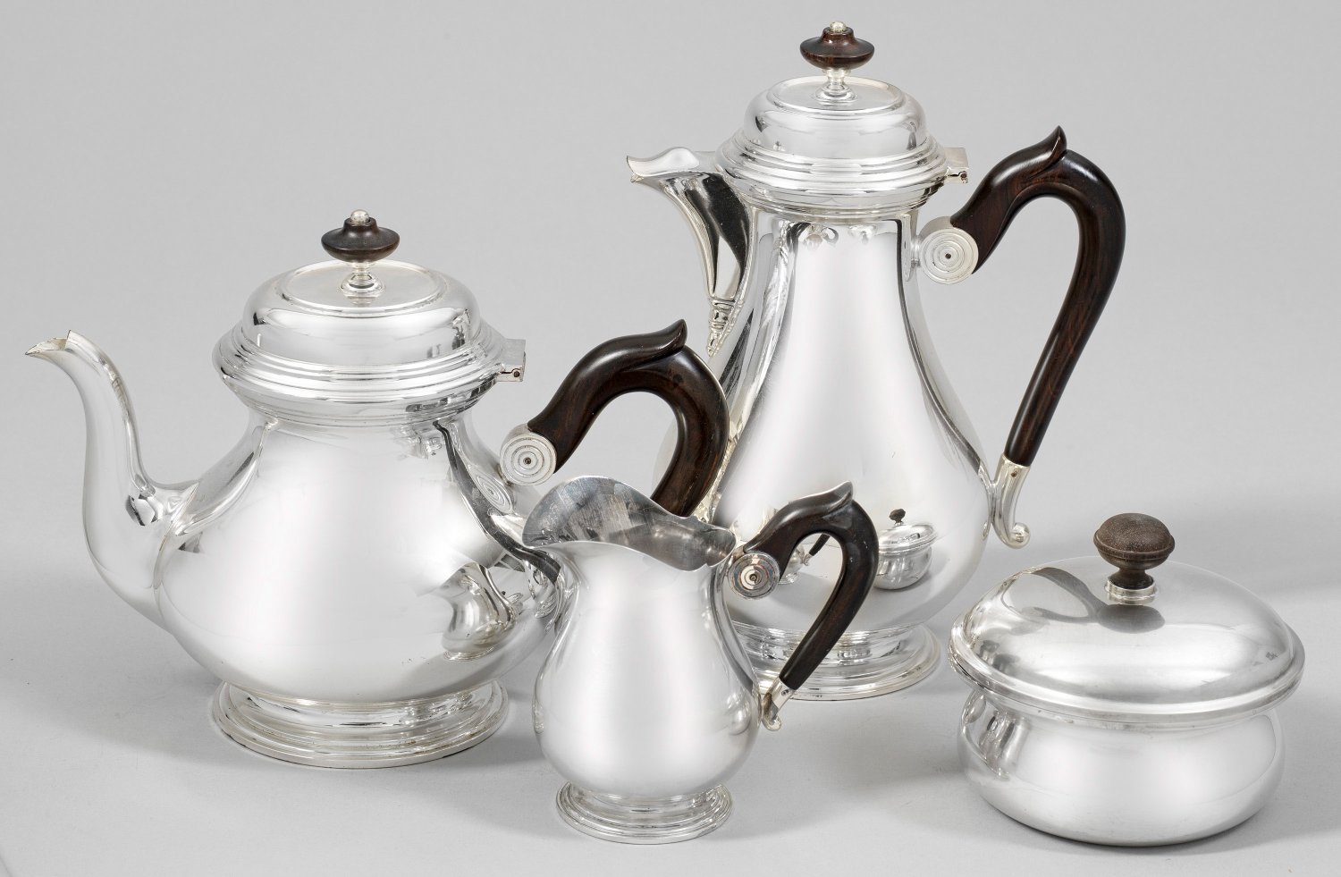 Kaffee- und Teeservice Silber. 4-tlg.; Tee- und Kaffeekanne, Sahnegießer und Zuckerschale. Birnförmiger Korpus mit glatter Wandung. Ebonisierter Ohrenhenkel und Deckelknauf. Gest. 800 und 925, Herstellerzeichen. Gew. zus. ca. 1532 g. H. 9 cm - 23 cm.