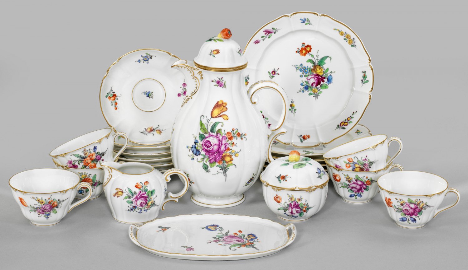 Kaffeeservice mit Blumendekor für sechs Personen. 16-tlg.; Kaffeekanne, Zuckerdose, Sahnegießer, 6 Tassen mit Untertassen, 6 Kuchenteller, Tablett. Form "Rokoko" mit mehrfach eingezogener Wandung. Farbenprächtiger Dekor aus sommerlichen Blumenbuketts und Streublumen in feiner polychromer Malerei. Manufakturmarke. Kannen-H. 25 cm. Kuchenteller-D. 20 cm.