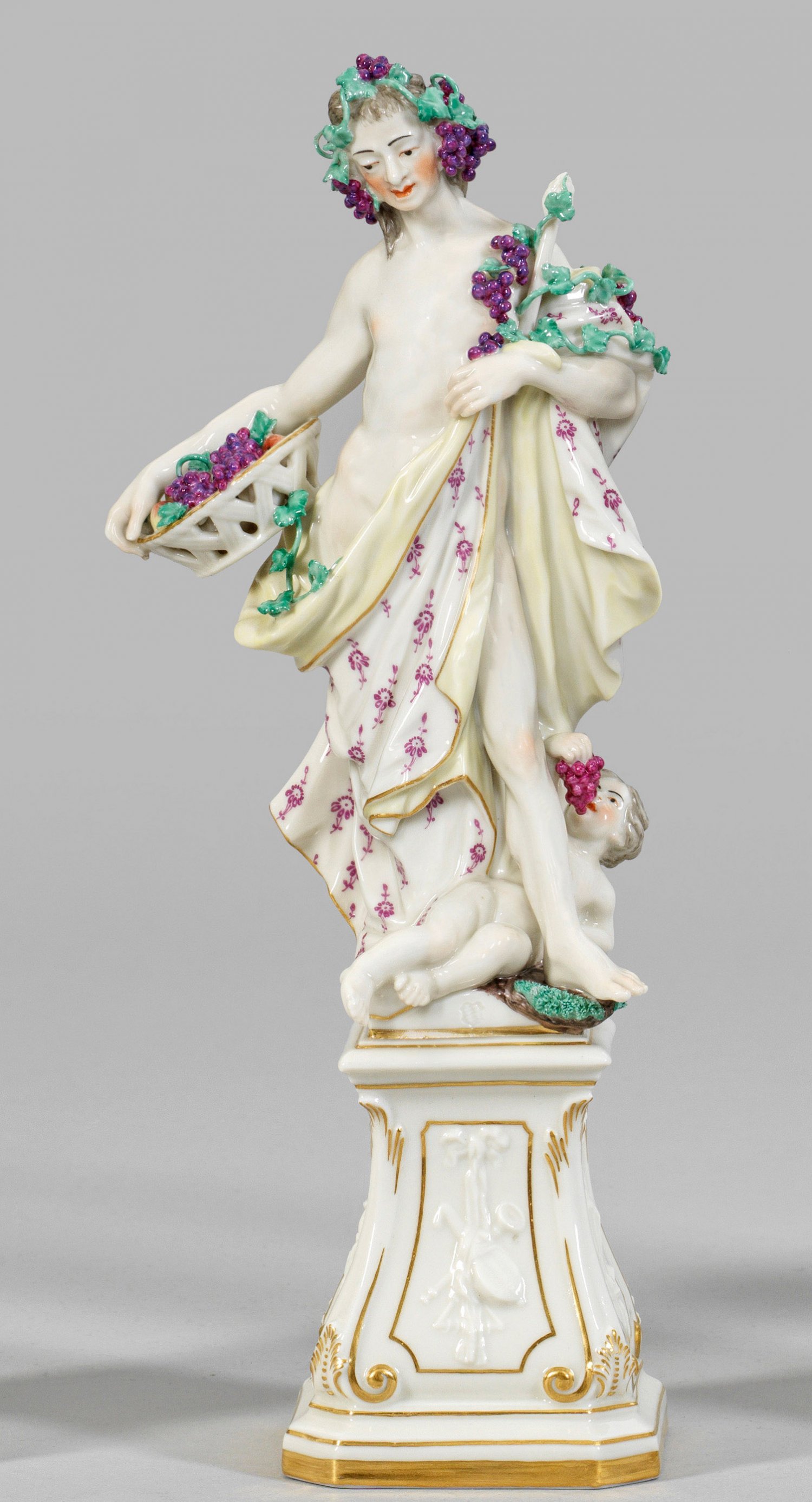 Allegorische Figur "Der Herbst" aus der Serie "Jahreszeiten" nach Alt-Frankenthaler Modell. Auf volutenförmig geschweiftem, profiliertem Podestsockel mit Symbolen der Musik stehender junger Mann, behangen mit Weinreben, in der rechten Hand einen Früchtekorb haltend. Unterhalb liegender Putto mit Trauben. Polychrome Malerei mit Goldkonturierung. Entw. Konrad Link. Manufakturmarke. H. 28,5 cm.