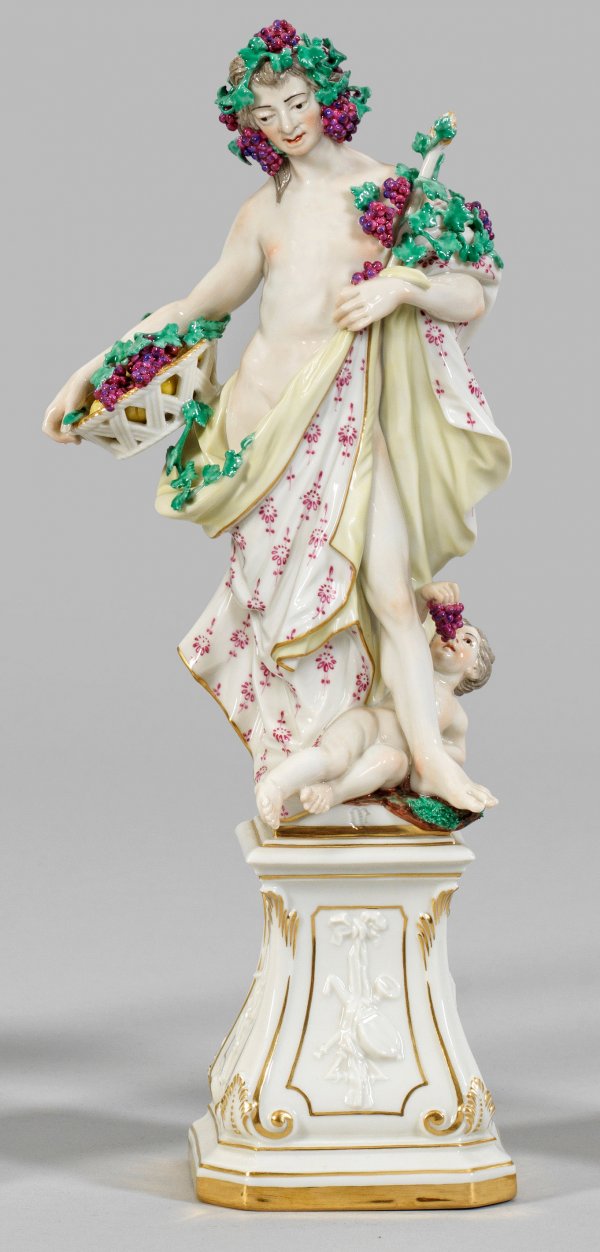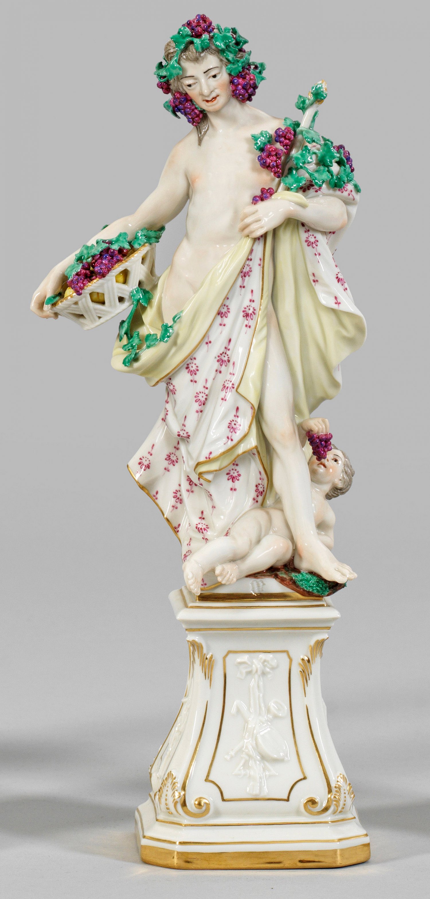 Allegorische Figur "Der Herbst" aus der Serie "Jahreszeiten" nach Alt-Frankenthaler Modell. Auf volutenförmig geschweiftem, profiliertem Podestsockel mit Symbolen der Musik stehender junger Mann, behangen mit Weinreben, in der rechten Hand einen Früchtekorb haltend. Unterhalb liegender Putto mit Trauben. Polychrome Malerei mit Goldkonturierung. Entw. Konrad Link. Manufakturmarke. H. 28,5 cm.