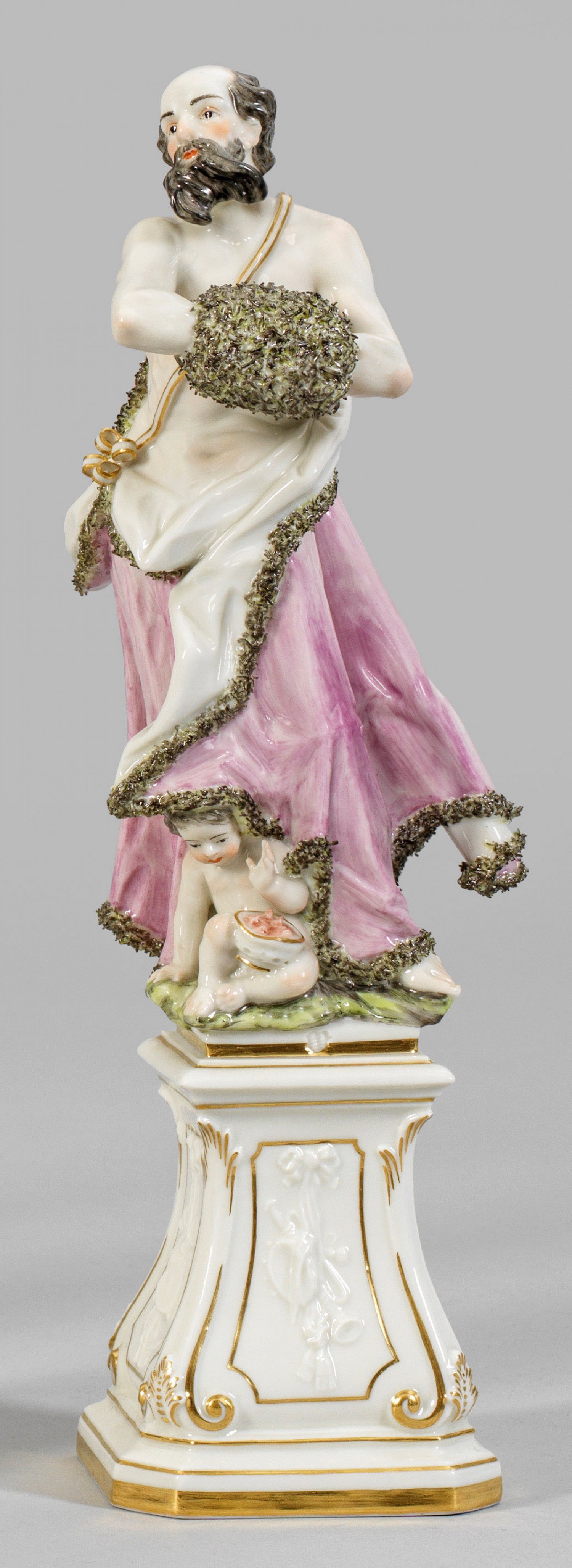 Allegorische Figur "Der Winter" aus der Serie "Jahreszeiten" nach Alt-Frankenthaler Modell. Auf volutenförmig geschweiftem, profiliertem Podestsockel mit Symbolen der Musik stehender bärtiger Mann in pelzgefüttertem Gewand und Muff. Unterhalb sitzender Putto mit Feuerschale. Polychrome Malerei mit Goldkonturierung. Entw. Konrad Link. Manufakturmarke. H. 27,5 cm.
