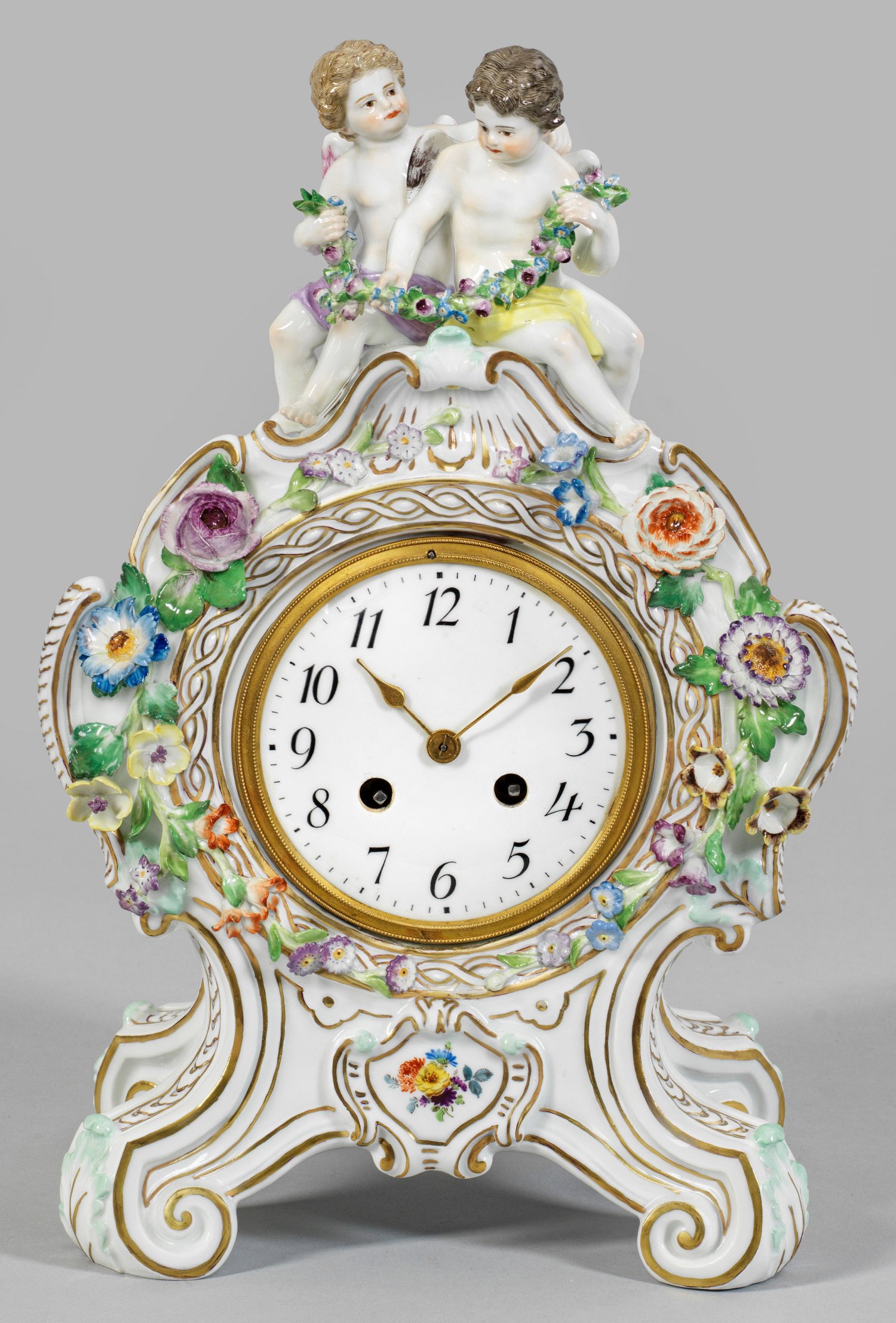 Porzellanpendule mit Putten Über vier eingerollten Voluten balusterförmig aufsteigender Uhrenkorpus, bekrönt von vollplastischem Amorettenpaar mit Rosengirlande. Umlaufender Dekor aus Streublumen und Blumengebinden. Schauseitig kartuschenartig gerahmtes und von plastisch aufgelegten Blütenranken umzogenes Emailzifferblatt mit arabischen Zahlen. Halbstundenschlag auf Glocke. Entw. Ernst August Leuteritz, Schwertermarke. H. 34 cm. 22 cm x 14 cm.