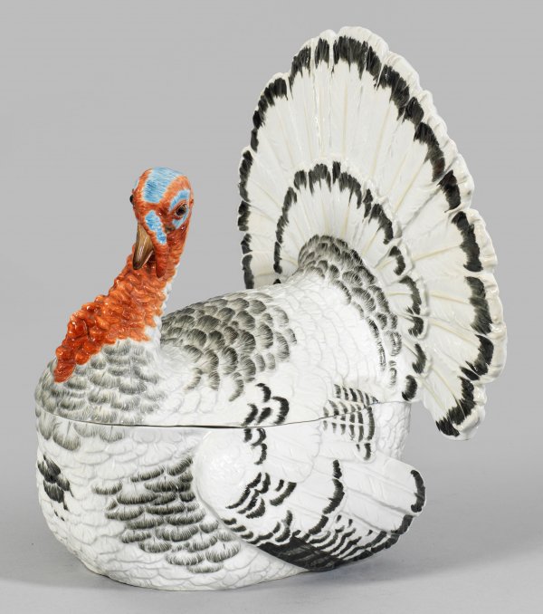 Große Terrine in Gestalt eines Truthahnes Sitzender Truthahn mit vorgewölbter Brust und aufgestellten, fächerförmigen Schwanzfedern in äußerst naturgetreuer Ausformung mit naturalistisch reliefiertem Gefieder in Schwarz- und Grautönen sowie unbefiedertem, polychrom staffiertem Kopf. Neuausformung, wohl nach Entw. von Johann Joachim Kaendler. Modell-Nr. 386. Minim. best.; Schwertermarke. H. 38 cm. 28 cm x 36 cm.