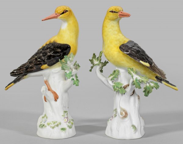 Paar Figuren eines Pirols Auf hohem, mit plastischen Blättern belegtem Stamm sitzender Pirol mit angelegten bzw. ausgebreiteten Flügeln. Naturalistisch reliefiertes, schwarzgrau und gelb staffiertes Gefieder. Polychrome Malerei. Entw. Johann Joachim Kaendler und Johann Gottlieb Ehder. Rest.; Schwertermarke. H. 25,5 cm.