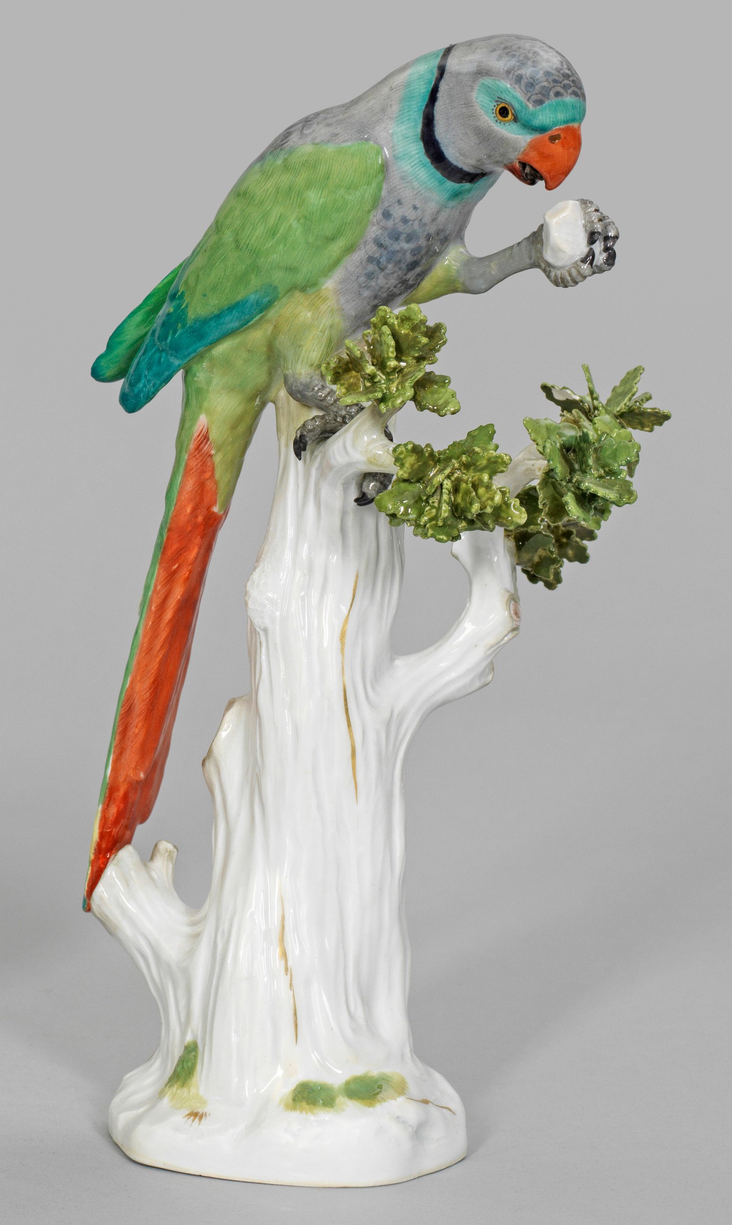 Papagei Auf hohem Baumstamm sitzender Papagei mit angelegten Flügeln. Farbenfrohes, naturalistisch gezeichnetes Federkleid. Polychrome Malerei. Entw. Johann Joachim Kaendler. Rest.; Schwertermarke. H. 28 cm.