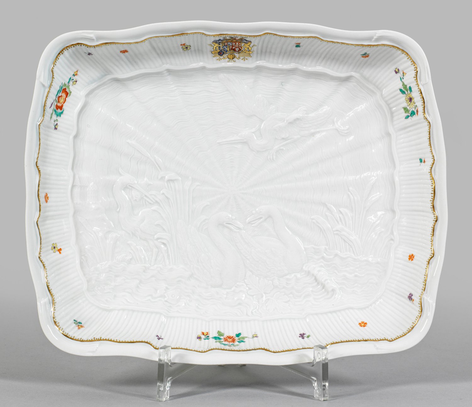 Anbietschale mit Schwanenservice-Dekor Quadratische, geschweifte Form. Feiner, oberhalb gerippter Reliefdekor aus zwei einander zugeneigten Schwänen sowie fliegendem und zwischen hohem Schilf stehendem Reiher mit Indianischem Blütendekor sowie Allianzwappen des Grafen von Brühl und seiner Gemahlin in polychromer Malerei. Gekämmte Goldkante und -staffage. Entw. Johann Joachim Kaendler und Johann Friedrich Eberlein. Schwertermarke. 25,5 cm x 20,5 cm.