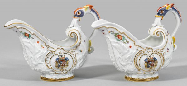Paar Saucieren mit Schwanenservice-Dekor Navettenförmiger, volutierter Korpus mit figürlichem Henkel in Gestalt eines Delphins. Auf der Wandung feiner Reliefdekor aus zwei einander zugeneigten Schwänen, fliegendem und zwischen hohem Schilf stehendem Reiher. Farbiger Indianischer Blütendekor sowie schauseitiges, kartuschengerahmtes Allianzwappen des Grafen von Brühl und seiner Gemahlin in polychromer Malerei. Gekämmte Goldkante und -staffage. Entw. Johann Joachim Kaendler und Johann Friedrich Eberlein. Schwertermarke. H. 14 cm. 19 cm x 9 cm.