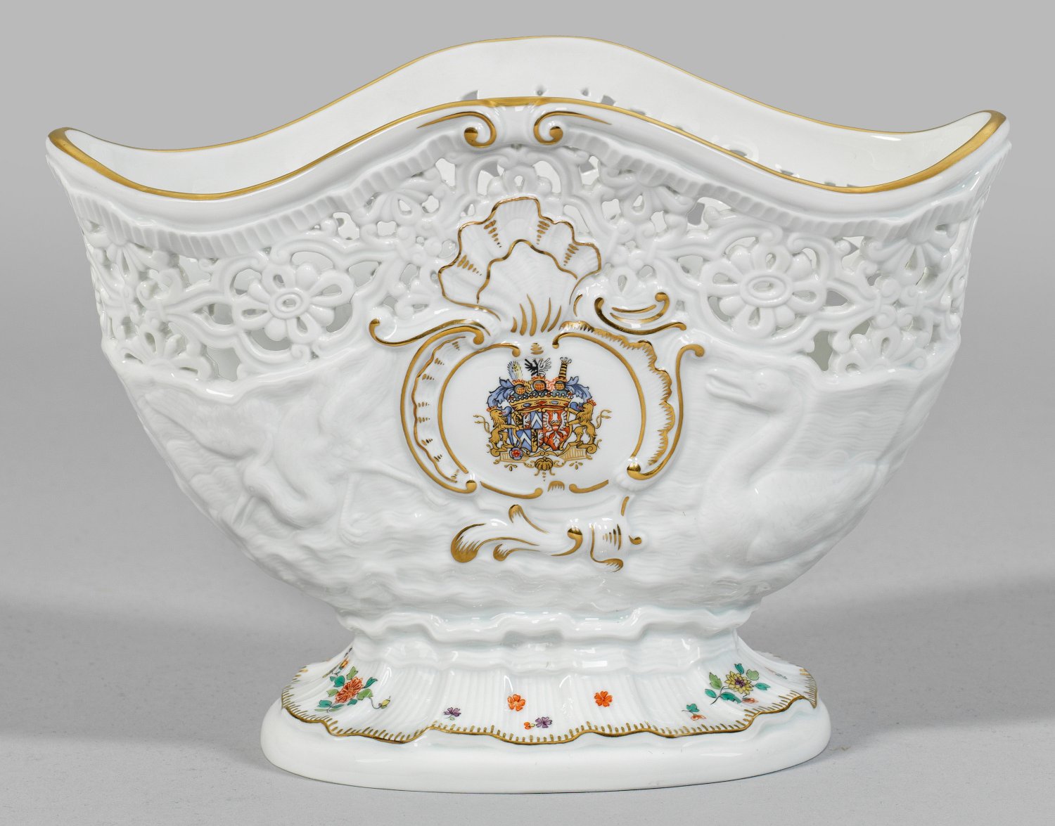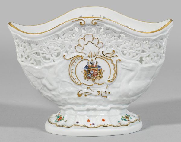 Serviettenhalter mit Schwanenservice-Dekor Ovaler, oberhalb floral durchbrochen gearbeiteter Korpus auf eingezogenem, geripptem Stand. Feiner Reliefdekor aus zwei einander zugeneigten Schwänen sowie fliegendem und zwischen hohem Schilf stehendem Reiher. Umlaufend farbiger Indianischer Blütendekor. Schauseitig rocailleförmig gerahmte Kartusche mit Allianzwappen des Grafen von Brühl und seiner Gemahlin in polychromer Malerei. Gekämmte Goldkante und -staffage. Entw. Johann Joachim Kaendler und Johann Friedrich Eberlein. Schwertermarke. H. 17 cm. 23 cm x 12 cm.