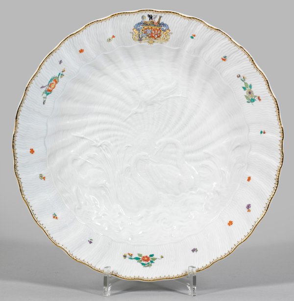 Große Anbietschale mit Schwanenservice-Dekor Runde, gemuldete Form. Im Spiegel feiner Reliefdekor aus zwei einander zugeneigten Schwänen sowie fliegendem und zwischen hohem Schilf stehendem Reiher mit farbigem Indianischem Blütendekor sowie Allianzwappen des Grafen von Brühl und seiner Gemahlin in polychromer Malerei. Gekämmte Goldkante. Entw. Johann Joachim Kaendler und Johann Friedrich Eberlein. Schwertermarke. D. 30 cm.