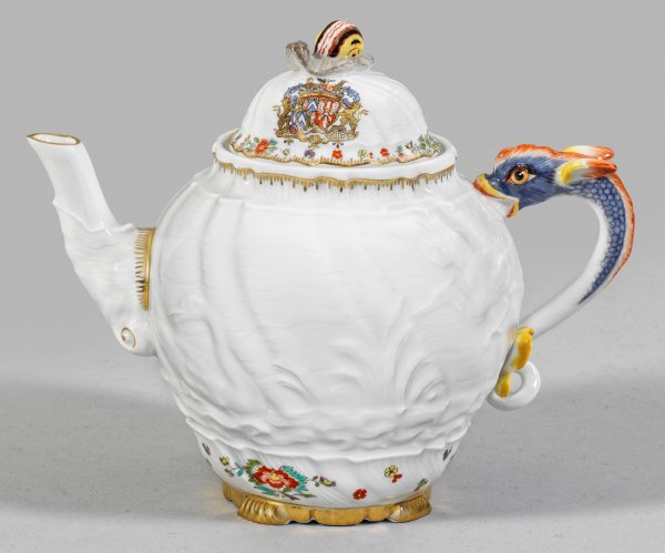 Teekanne mit Schwanenservice-Dekor Bauchige Form mit aufgewölbtem Deckel, mittig plastischer Knauf in Gestalt einer Schnecke. Figürlicher Henkel als Delphin. Auf der Wandung feiner Reliefdekor aus zwei einander zugeneigten Schwänen, fliegendem und zwischen hohem Schilf stehendem Reiher. Farbiger Indianischer Blütendekor sowie Allianzwappen des Grafen von Brühl und seiner Gemahlin in polychromer Malerei. Gekämmte Goldkante und -staffage. Entw. Johann Joachim Kaendler und Johann Friedrich Eberlein. Schwertermarke. H. 15 cm.