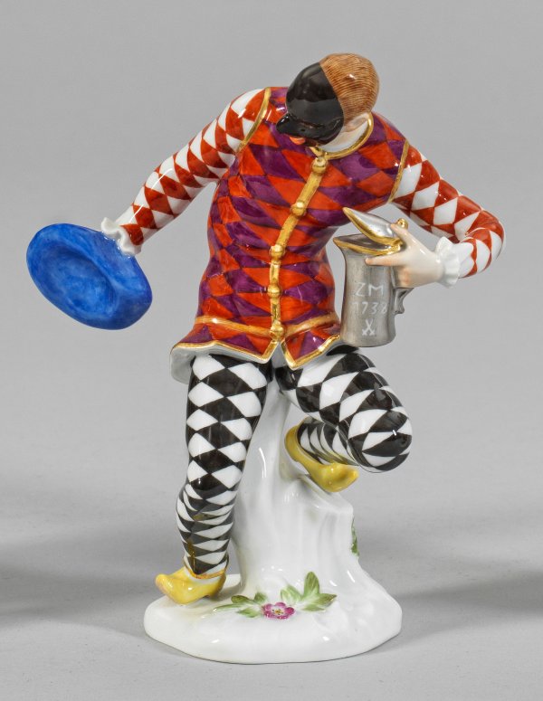 Harlekin mit Deckelkanne aus der Italienischen Komödie. Auf rundem, mit plastischen Blüten und Blättern belegtem Sockel sich zum Gruß verneigender Hofkomödiant Joseph Ferdinand Müller, genannt "Zanni Müller", als Harlekin in kariertem Kostüm mit schwarzer Maske, in der rechten Hand einen blauen Hut, in der Linken eine geöffnete Bierkanne haltend, bez. "ZM 1738". Polychrome Malerei mit Goldstaffage. Entw. Johann Joachim Kaendler. Schwertermarke. H. 24,5 cm.