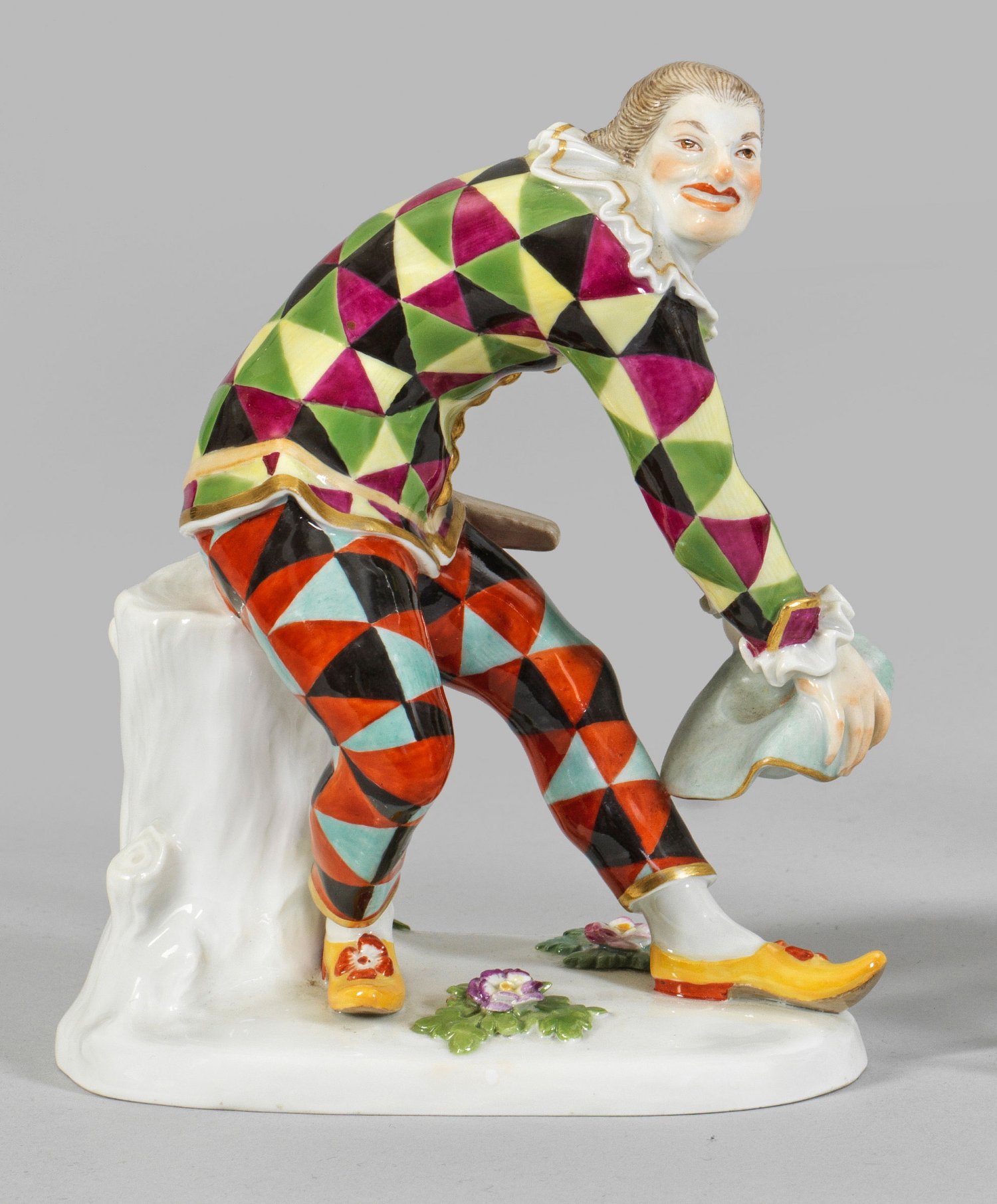 Grüßender Harlekin aus der Italienischen Komödie. Auf unregelmäßigem, mit plastischen Blüten und Blättern belegtem Sockel, ein sich zum Gruß verneigender junger Komödiant in kariertem Kostüm mit Hut. Polychrome Malerei mit Goldstaffage. Entw. Johann Joachim Kaendler. Minim. rest.; Schwertermarke. H. 16 cm.