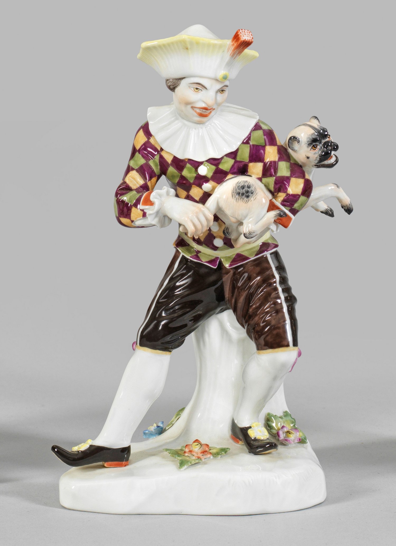 Harlekin mit Mops aus der Italienischen Komödie. Auf unregelmäßigem, mit plastischen Blüten und Blättern belegtem Sockel stehender junger Komödiant in kariertem Wams, brauner Hose mit Hut, einen Mops wie eine Drehleier spielend. Polychrome Malerei mit Goldstaffage. Entw. Johann Joachim Kaendler. Schwertermarke. H. 17,5 cm.