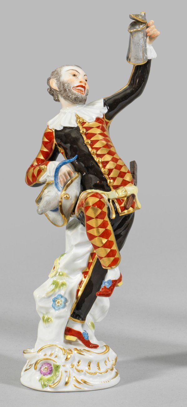 Tanzender Harlekin mit Deckelkanne aus der Italienischen Komödie. Auf hohem, rocaillereliefiertem Sockel, in Tanzhaltung stehender Hofkomödiant Joseph Ferdinand Müller, genannt "Zanni Müller" als Harlekin in kariert-schwarzem Kostüm, in der erhobenen Linken eine geöffnete Bierkanne haltend. Polychrome Malerei mit reicher Goldstaffage. Entw. Johann Joachim Kaendler. Minim. rest./rep.; Schwertermarke. H. 24,5 cm.