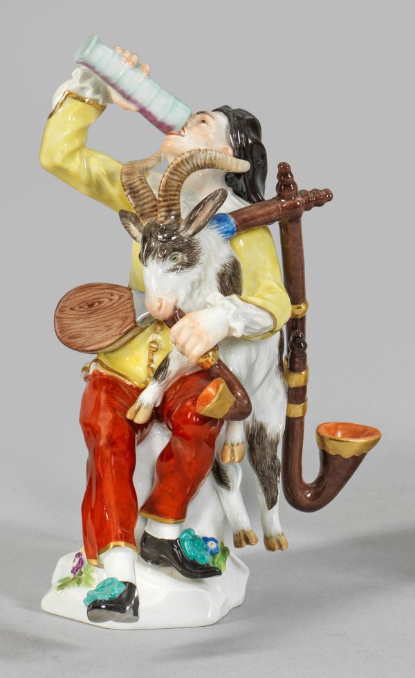 Sitzender Harlekin mit Bockspfeife aus der Italienischen Komödie. Auf einem Felssockel sitzender, trinkender Harlekin in gelbem Wams und roter Hose, unter dem rechten Arm einen Blasebalg, unter dem Linken ein Ziegenbockfell als Sackpfeife haltend. Polychrome Malerei mit Goldstaffage. Entw. Johann Joachim Kaendler. Schwertermarke. H. 14,5 cm.