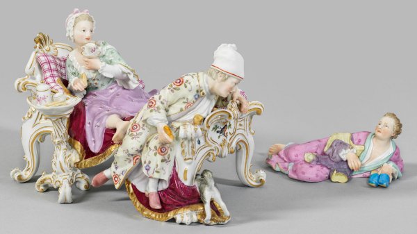 "Der entdeckte Liebhaber". Originaltitel 2-tlg.; In einem prunkvollen Rokoko-Bett mit feinem Vogel- und Insektendekor sitzende Dame mit einer Tasse Kakao, an dessen Fußende der Ehegatte, den auf dem Boden davon schleichenden jungen Liebhaber entdeckend. Hinter dem karierten Bettlaken versteckter Amor mit Pfeil. Polychrome Malerei mit Goldstaffage. Entw. Johann Joachim Kaendler. Minim. best.; Rest.; Schwertermarke. H. 5 cm - 12 cm. 6 cm - 20 cm x 11 cm - 13 cm.