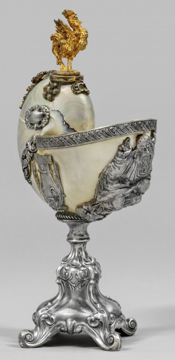 Historismus-Nautiluspokal Silber. Auf vierfüßigem, mit Akanthus- und Blattrelief verziertem Stand hell perlmutt-schimmernder Nautilus mit Silberapplikationen. Auf der vorderen Schmalseite Gottvater mit Segensgestus und Erdkugel in der Hand in ganzfigurigem Hochrelief. An den Seiten aufgelegte Lyramotive. Vergoldeter vollplastischer Hahn als Bekrönung. Gest. 925. H. 24 cm.