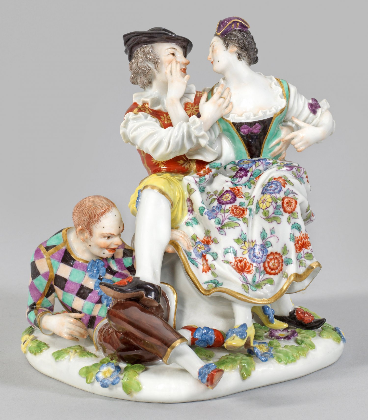 "Der indiskrete Harlekin". Originaltitel Auf unregelmäßigem, mit plastischen Blüten und Blättern belegtem Sockel sitzendes, innig einander zugewandtes Liebespaar. Zu ihren Füßen liegender Harlekin im Kostüm, einen Blick unter den Rock der Dame werfend. Polychrome Malerei mit Goldstaffage. Entw. Johann Joachim Kaendler. Modell-Nr. 344. Schwertermarke. H. 16 cm.