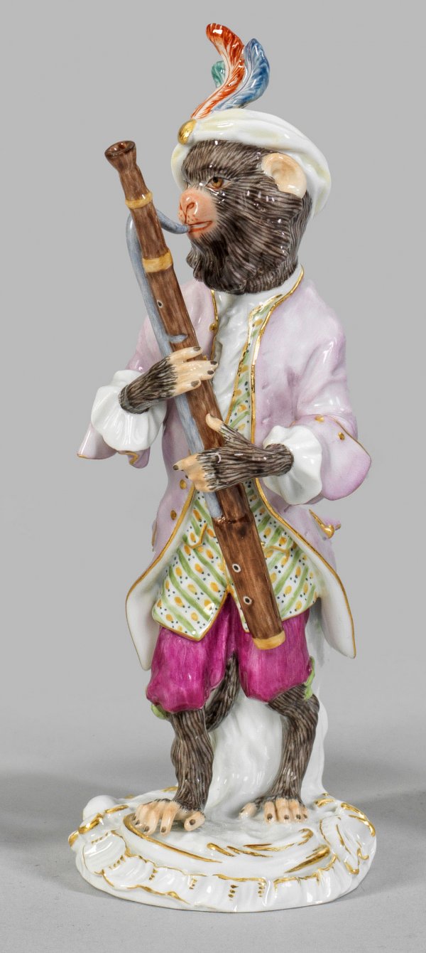 A porcelain figure of a bassoon player from the Monkey orchestra. Crossed swords mark.