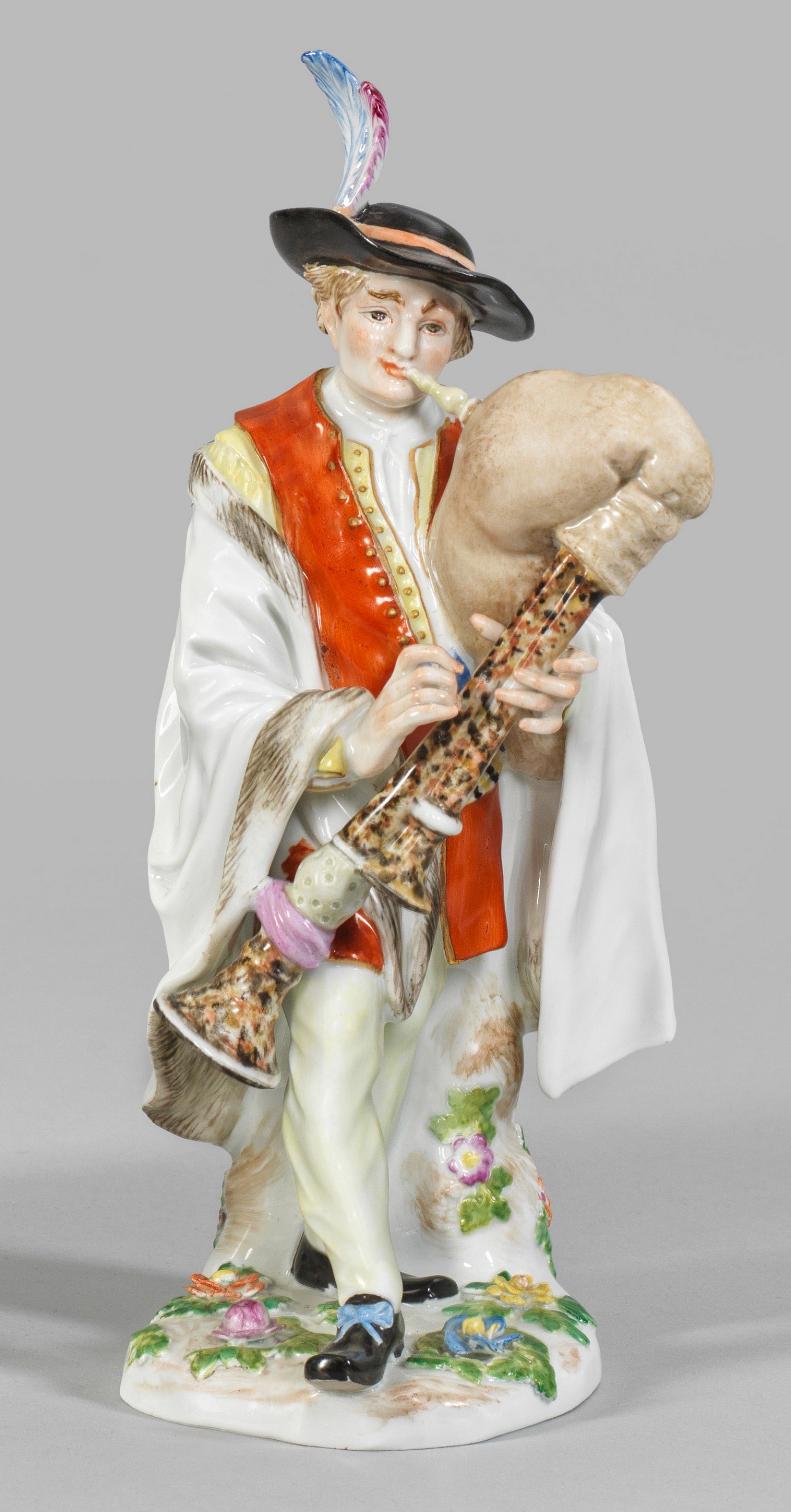 Dudelsackspieler Auf unregelmäßigem, mit plastischen Blüten und Blättern belegtem Sockel stehender, eine große Sackpfeife spielender Musikant aus den Savoyen. Polychrome Malerei. Entw. Johann Joachim Kaendler/Friedrich Elias Meyer. Minim. best./rest.; kleine Brandrisse. Schwertermarke. H. 25,5 cm.