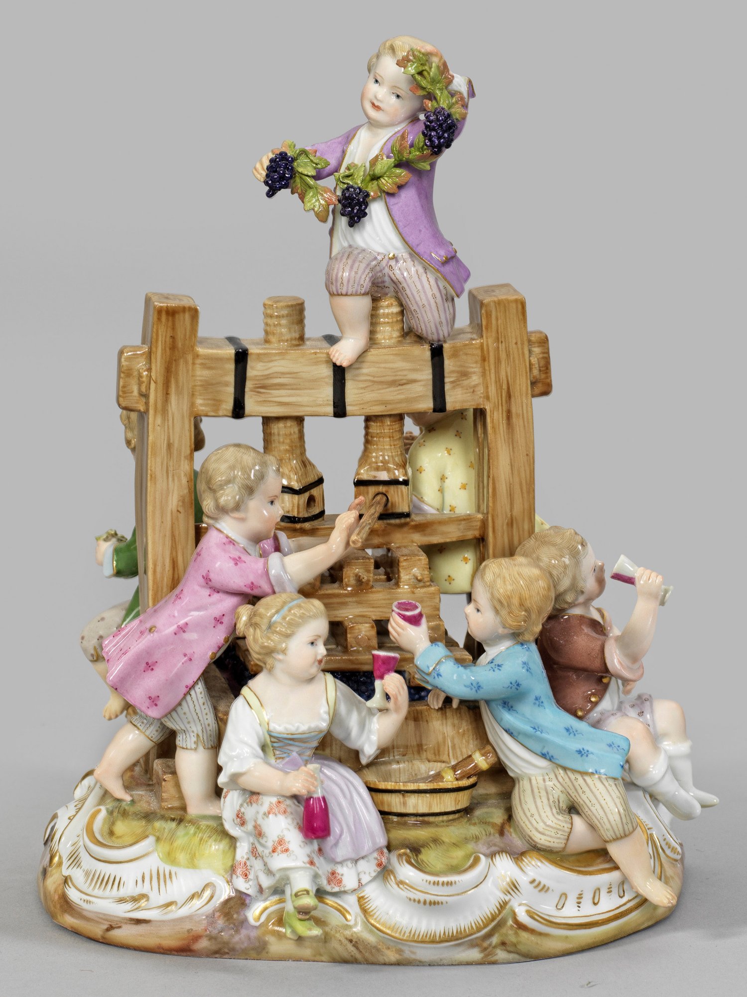 "Die Weinpresse". Originaltitel Auf rocaillereliefiertem Sockel große Weinpresse, umgeben von sieben Winzerkindern beim Pressen von Trauben. Schauseitig stehender Winzerjunge sowie drei weitere Winzerkinder, aus gefüllten Weingläsern trinkend. Oberhalb sitzender Knabe mit Weingirlande. Polychrome Malerei mit Goldkonturierung. Minim. rest.; Schwertermarke. H. 25 cm.