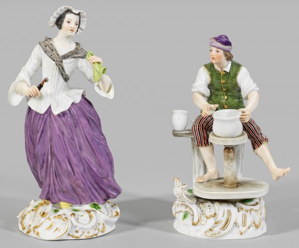 Schneidersfrau Auf rocaillereliefiertem Sockel stehende junge Dame, in den Händen ein Markierrad bzw. ein grünes Tuch haltend. Polychrome Malerei mit Goldstaffage. Entw. Johann Joachim Kaendler. Minim. rest.; Schwertermarke. H. 22 cm.