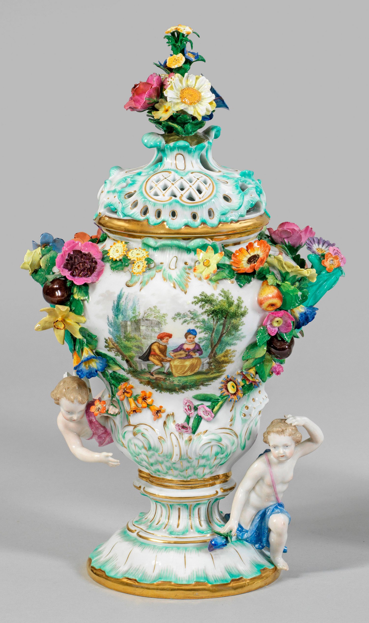 Potpourri-Deckelvase Über hochgezogenem Rundfuß balusterförmiger, blattreliefierter Korpus mit vollplastischen Putten. Seitlich geschweifte Blatthenkel. Korrespondierender, durchbrochen gearbeiteter Deckel mit Knauf als Blumenbukett. Beidseitig der Wandung, von stark plastischen Frucht- und Blütenranken umzogene Reserve mit galanten Watteauszenen in Parklandschaft. Streublumendekor. Polychrome Malerei mit reicher Goldstaffage. Entw. Johann Joachim Kaendler. Minim. best.; Unw. rest.; Schwertermarke. H. 41 cm.