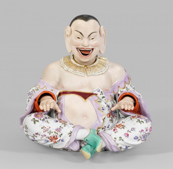 Große Wackelpagode Mit verschränkten Beinen sitzender, dickbäuchiger Chinese in weißem, mit asiatischen Blumen gemustertem Gewand mit lavendelfarbenem Innenfutter, goldornamentiertem Spitzenkragen sowie seegrünen Pantoffeln. Hände, Kopf und rote Zunge beweglich. Polychrome Malerei mit Goldstaffage. Entw. Johann Joachim Kaendler. Minim. Brandrisse. Schwertermarke. H. 31 cm.