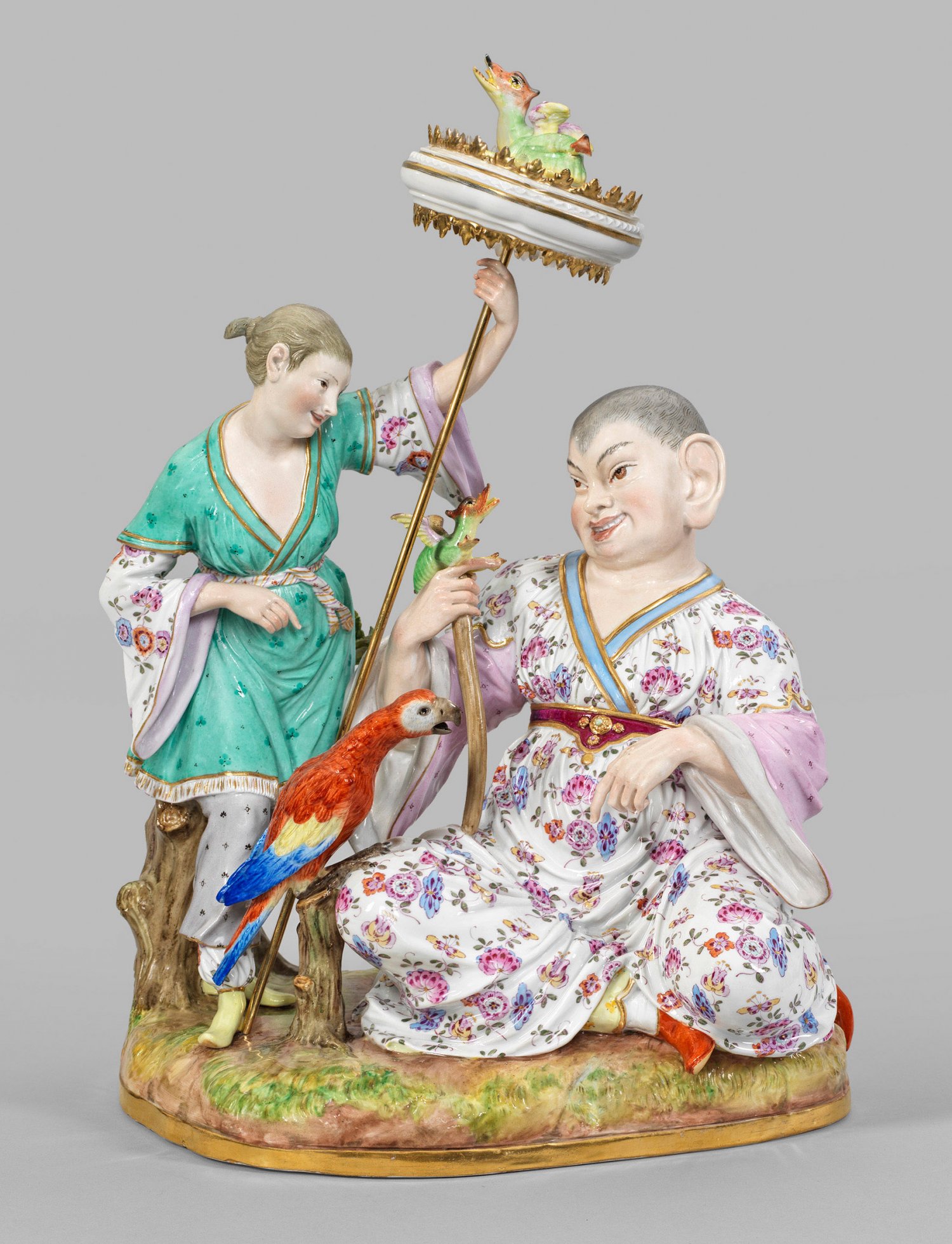 Große seltene "Pagodengruppe". Originaltitel Auf naturalistisch gestaltetem Sockel sitzender Chinese in weißem, mit Indianischen Blumen gemustertem Gewand und schmuckbesetztem Gürtel, in der rechten Hand einen Stab mit plastischer Drachenbekrönung haltend. Seitlich stehende Dame in lavendelfarbener Hose mit seegrünem, blütengemustertem Gewand, dem Herrn mit großem Schirm Schatten spendend sowie ein sitzender Papagei auf Ast. Polychrome Malerei mit Goldstaffage. Entw. Johann Joachim Kaendler. Modell-Nr. 741. Minim. best./rest.; Schwertermarke. H. 33 cm.