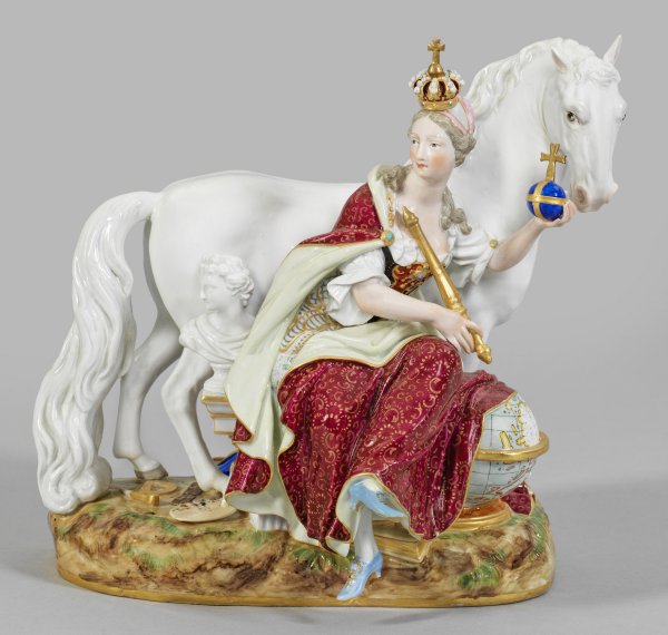 Große Figurengruppe "Allegorie von Afrika" aus der Serie "Vier Erdteile". Ovaler, naturalistisch gestalteter und staffierter Sockel. Vor einem Apfelschimmel sitzende, bekrönte Personifikation in reich ornamentiertem Kleid und purpurfarbenem, mit Gold gemustertem Umhang. In der rechten Hand einen Reichsapfel emporhaltend, in der Linken ein Zepter. Zu ihren Füßen der Erdball, umgeben von Attributen der Schönen Künste sowie mehreren Trophäen. Polychrome Malerei mit reicher Goldstaffage. Entw. Johann Friedrich Eberlein und Johann Joachim Kaendler. Unw. rest.; Schwertermarke. H. 25 cm.