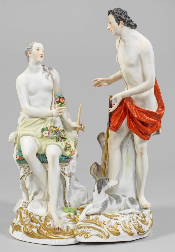 2-tlg. verschraubt. Unregelmäßiger, von reliefplastischen Rocaillen umzogener Sockel. An einem Baumstumpf stehender Kephalus, Sohn des Hermes und der Herse, im roten Hüfttuch mit großem Pfeil. Zu den Füßen sein liegender Hund Lälaps. Seitlich, über aufsteigenden Wolken sitzende Aurora, die Göttin der Morgenröte, auf einem Barockstuhl, mit plastischem Blütenkorb und Strauß. Polychrome Malerei mit reicher Goldstaffage. Entw. wohl Johann Joachim Kaendler oder Friedrich Elias Meyer. Modell-Nr. 2907. Unw. rest.; Schwertermarke. H. 46 cm. 30 cm x 25 cm.