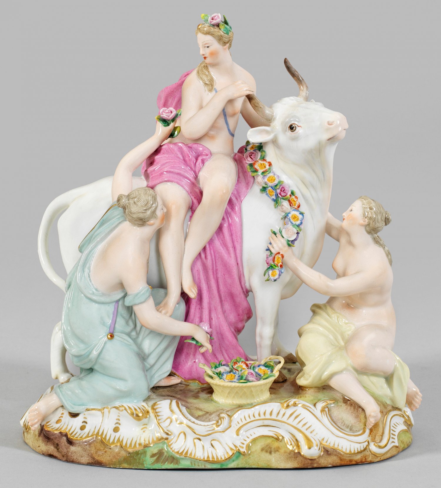 Figurengruppe "Europa auf dem Stier". Originaltitel Über rocaillereliefiertem, naturalistisch staffiertem Sockel, auf einem blumengeschmücktem Stier sitzende Europa. Zu ihren Füßen zwei kniende Nymphen mit Blumenkorb. Polychrome Malerei mit Goldkonturierung. Entw. Johann Joachim Kaendler. Rest.; Schwertermarke. H. 22 cm. 20 cm x 13 cm.
