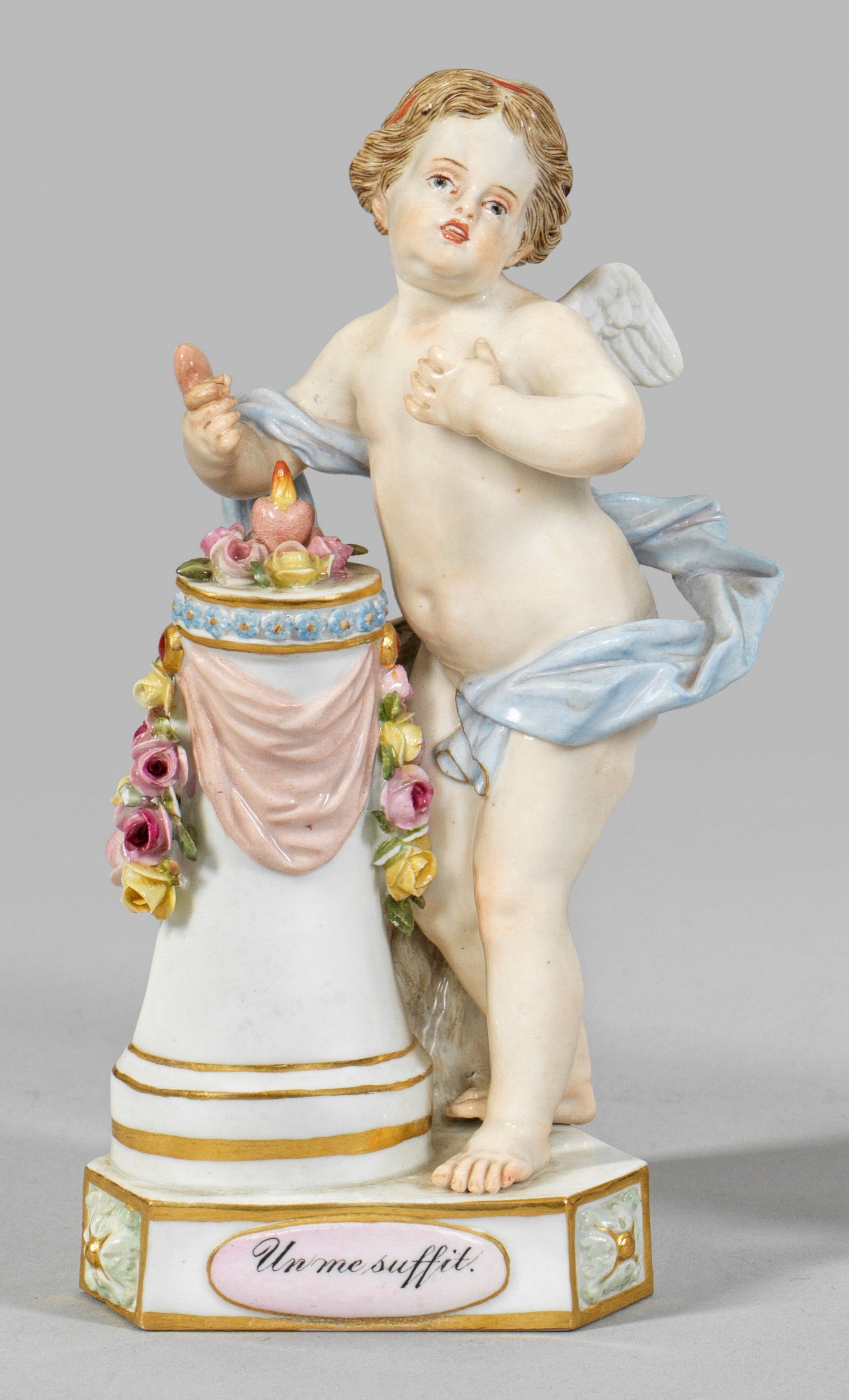 Devisenkind Dreiseitiger Sockel mit Rosetten, bez. "Un me suffit". An einer mit plastischen Blüten belegten Säule stehende Amorette, in der rechten Hand ein Herz haltend. Polychrome Malerei mit Goldkonturierung. Entw. Michel Victor Acier. Modell-Nr. F 8. Minim. besch./best.; Schwertermarke. H. 14 cm.