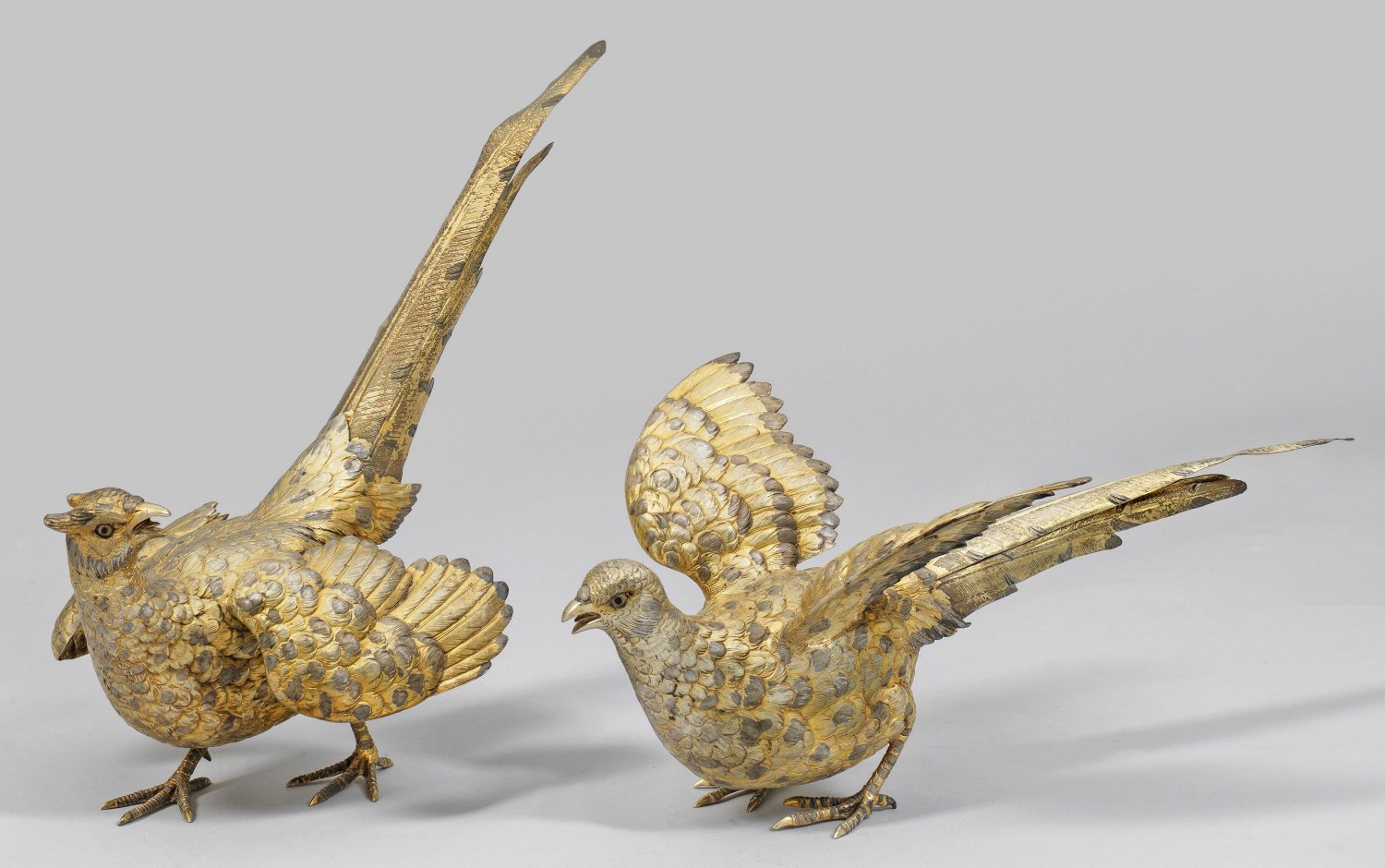 Großes Hanauer Fasanenpaar Silber, voll vergoldet. Gegenstücke. Naturalistische, vollplastische Ausarbeitung. Hahn und Henne mit detailliert ausgeführter Gefiederzeichnung. Gest. 800, Herstellermarke Wilhelm Weinranck. Gew. zus. ca. 1680 g.; H. ca. 18,5/31 cm.
