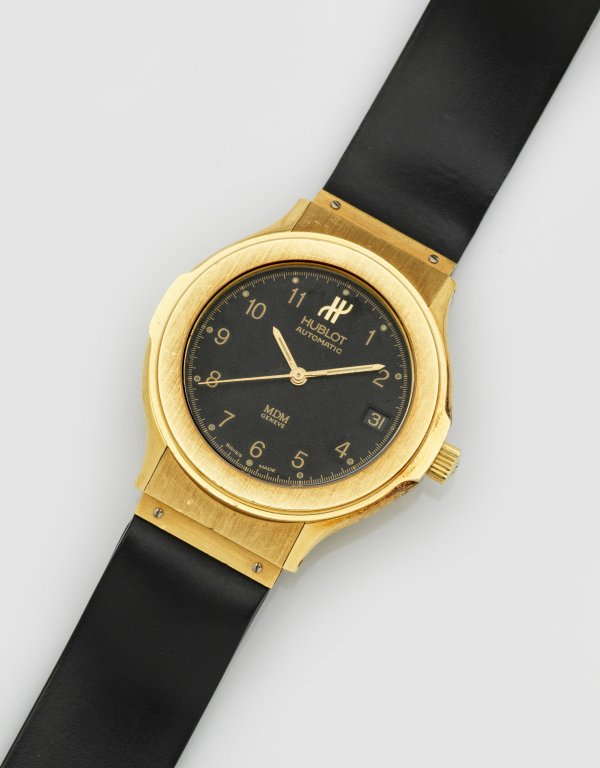 Herrenarmbanduhr von Hublot "Classic Fusion" Gelbgold, gest. 750. Rundes Uhrengehäuse mit aufgelegter Lunette, schwarzes Zifferblatt mit arabischen Zahlen und Lanzenzeigern mit Tritiumauflage, Datumsanzeige. Schwarzes Kautschuk-Armband mit doppelter Gold-Faltschließe. Automatikwerk. Ref.-Nr. 13912. Herstellerzeichen. Garantie-Karte.