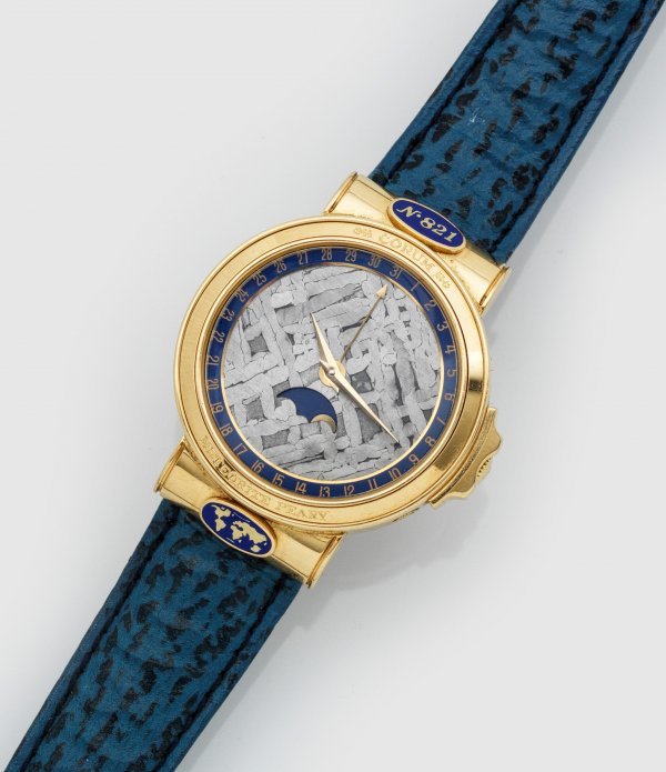 Limitierte Herrenarmbanduhr von CORUM "Meteroite Peary" Gelbgold, gest. 750. Rundes Uhrengehäuse, Zifferblatt aus Meteoritengestein, Gold-Lanzenzeiger. Automatikwerk mit Funktionen: Datum, Mondphase, Minuten- und Stundenanzeige. Ref.-Nr. 61.450.56. Royalblaues Lederarmband mit Gold-Faltschließe. Nr. 821. Gew. ca. 75,73 g.