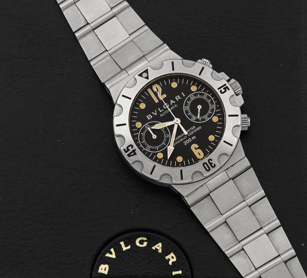 Herrenarmbanduhr von BVLGARI "Scuba" von 1996 Stahl. Rundes Uhrengehäuse, mit einseitig drehbarer Minutenskala, schwarzes Zifferblatt, arabische Zahlen, Indexe und Zeiger mit Tritiumauflage. Saphirglas. Automatikwerk mit Chronograph. Original-Box und Uhrenpass. Neupreis ca. € 6.500,-.