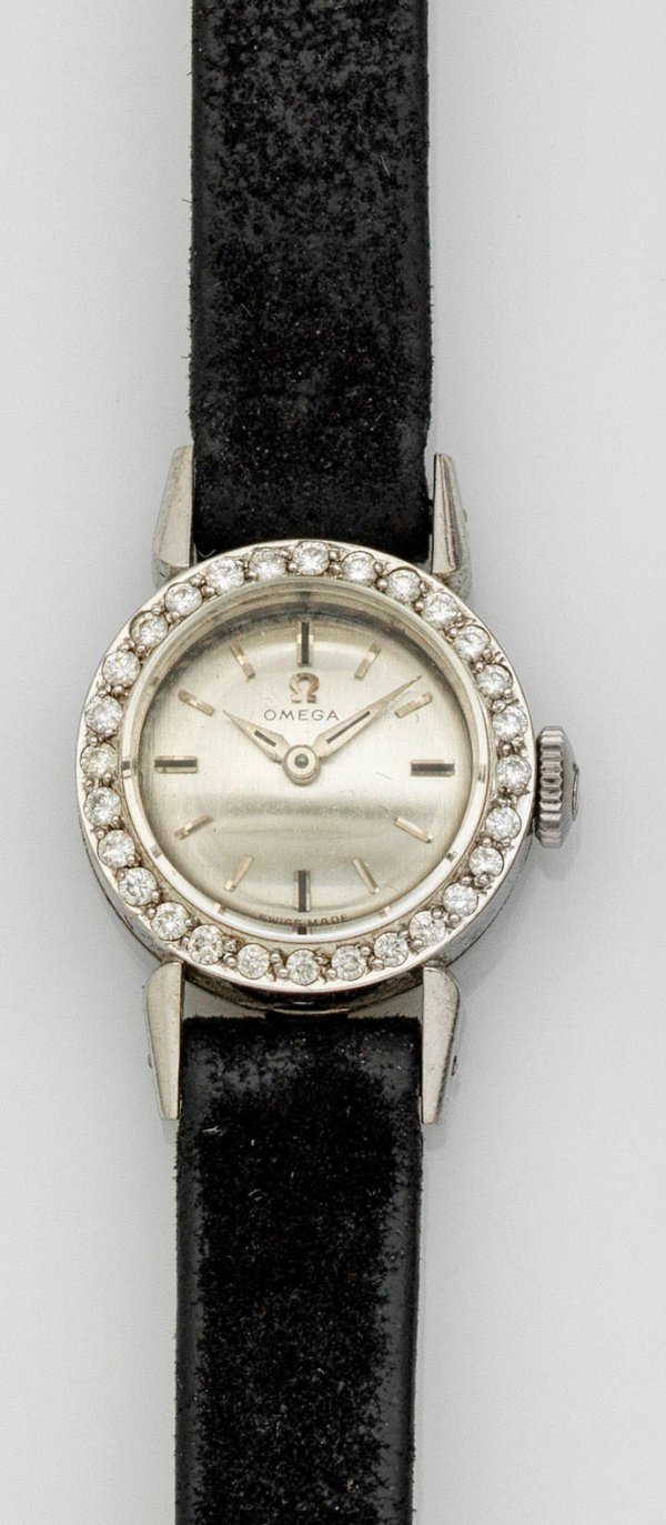 Damenarmbanduhr von Omega aus den 50er Jahren Weißgold, gest. 750. Rundes Uhrengehäuse, Lunette umlaufend mit Brillanten besetzt. Schwarzes Lederarmband mit Dornenschließe. Mechanisches Werk mit Handaufzug. Gew. ca.13,23 g.